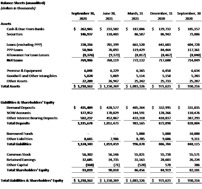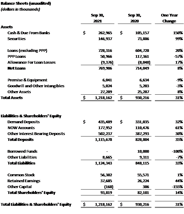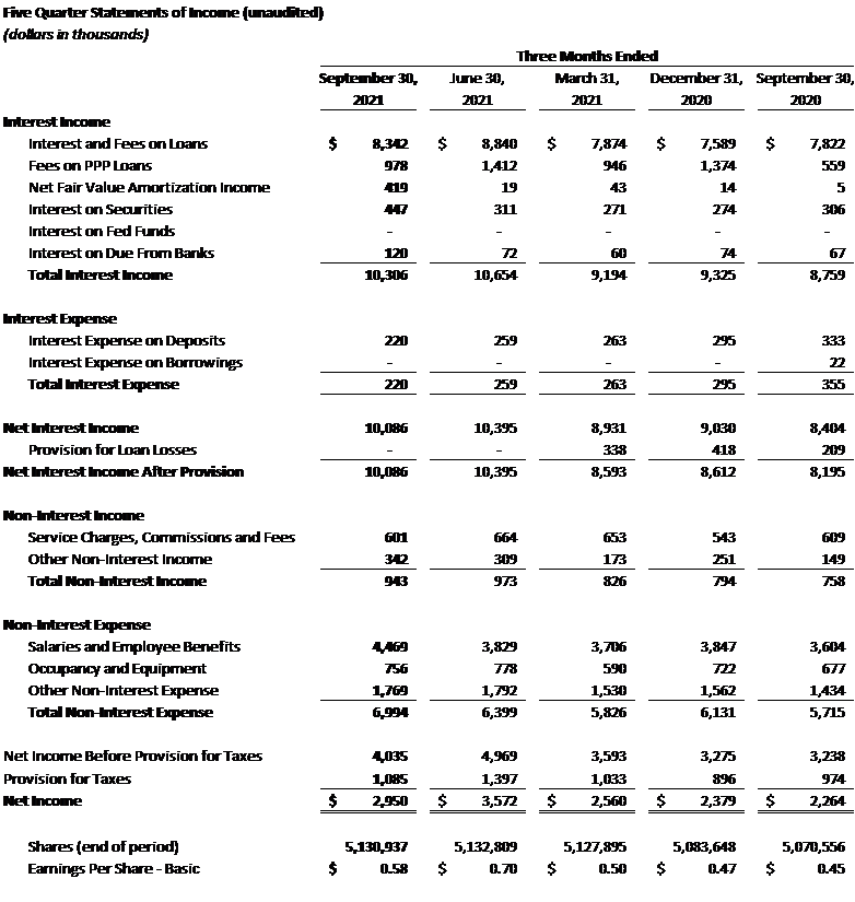 In 2021, the Bank has achieved an annualized return on average assets of 1.12% and return on average equity of 13.64%. Unaudited net income was $2,950,000 ($0.58 per share) for the third quarter ended September 30, 2021, compared to the $2,264,000 ($0.45 per share) earned in the same reporting period in the prior year.