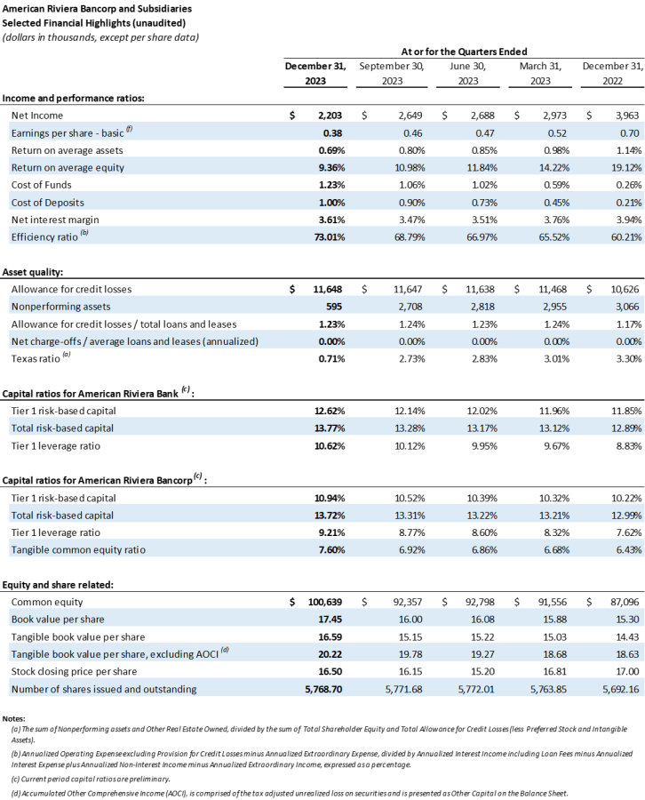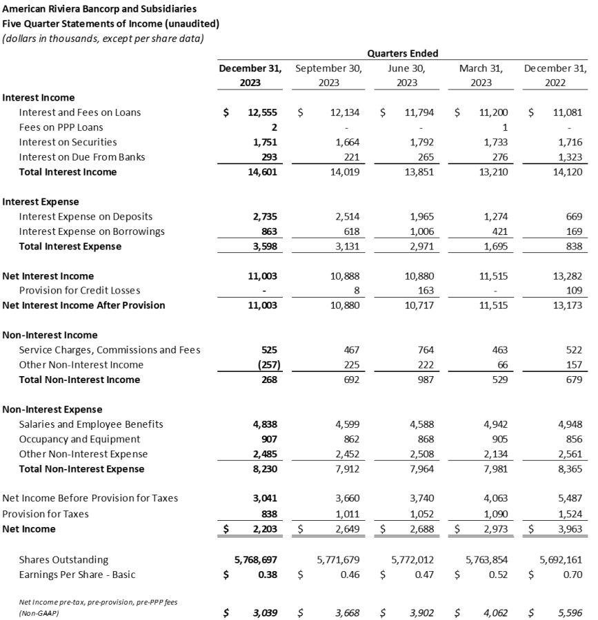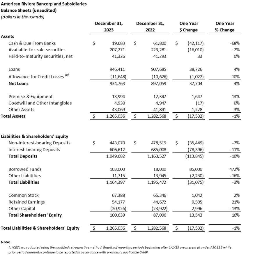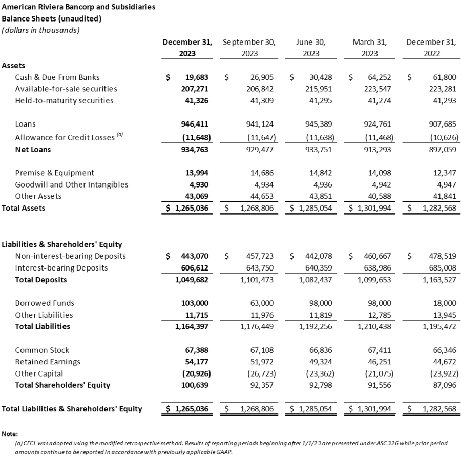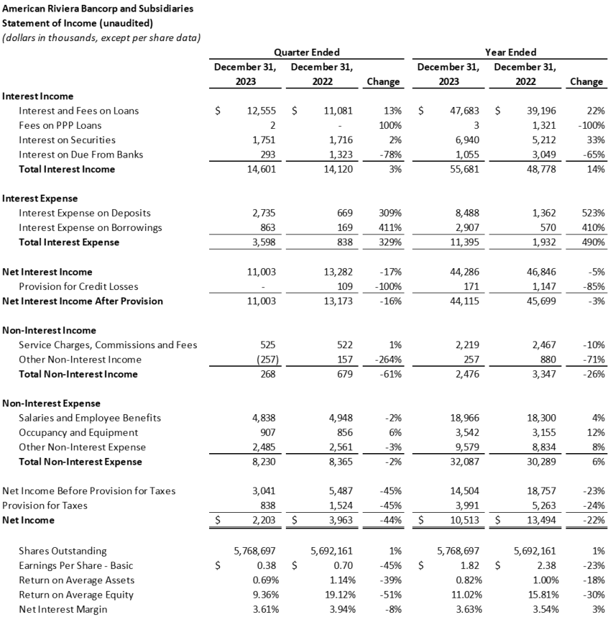 American Riviera Bancorp Announces Results for the Fourth Quarter of 2023