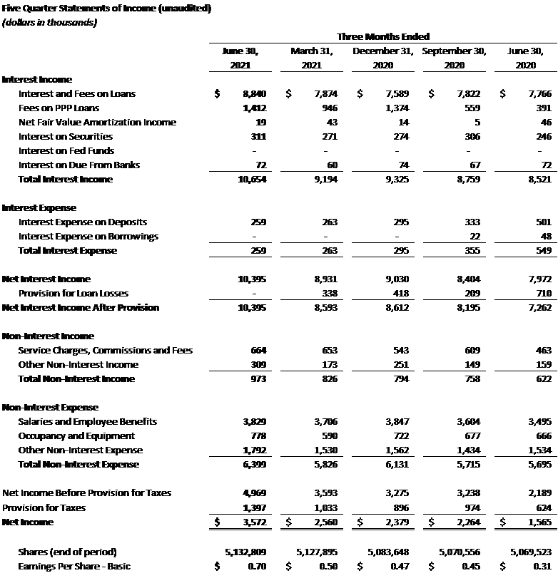 In 2021, the Bank has achieved an annualized return on average assets of 1.20% and return on average equity of 14.26%. Unaudited net income was $3,572,000 ($0.70 per share) for the second quarter ended June 30, 2021, compared to the $1,565,000 ($0.31 per share) earned in the same reporting period in the prior year. Net income in the second quarter of 2021 was positively impacted by a $751,000 loan interest recovery and accelerated recognition of Paycheck Protection Program (PPP) fee income upon loan forgiveness by the Small Business Administration (SBA).